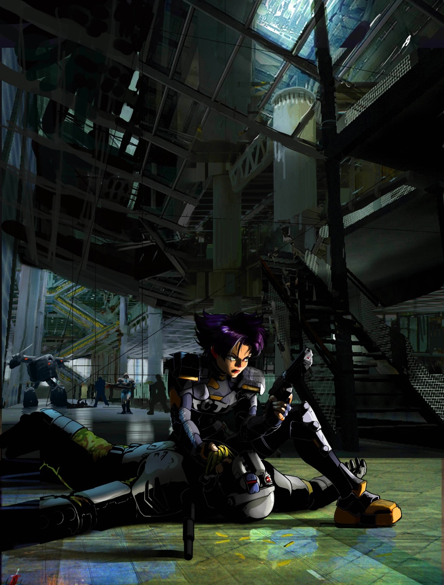 In this draft version, the Lorraine art at center is less overpainted and maintains an illustrative style, whereas in the final version Mullins takes more liberties with it and it resembles his normal style of painterly realism. Konoko and the Striker are also smaller in this version. Many black lines can be seen throughout this image (seemingly guidelines for perspective), most of which were painted over in the final image (but curiously, the ones in the background still remain).