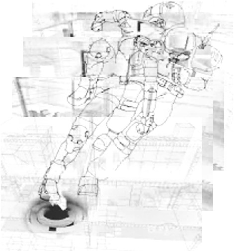 The first of two lost concept sketches that appear in the [[Trailers|1998 trailer]]. This one slides down the screen at 1m23s and has been pieced back together by Ezandora from intermittent flashing frames in the video and then color-inverted to enhance visibility. The style matches [[Alex Okita]]'s known concept art. | |||